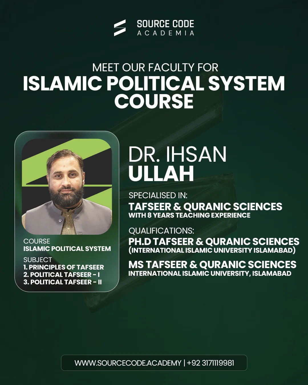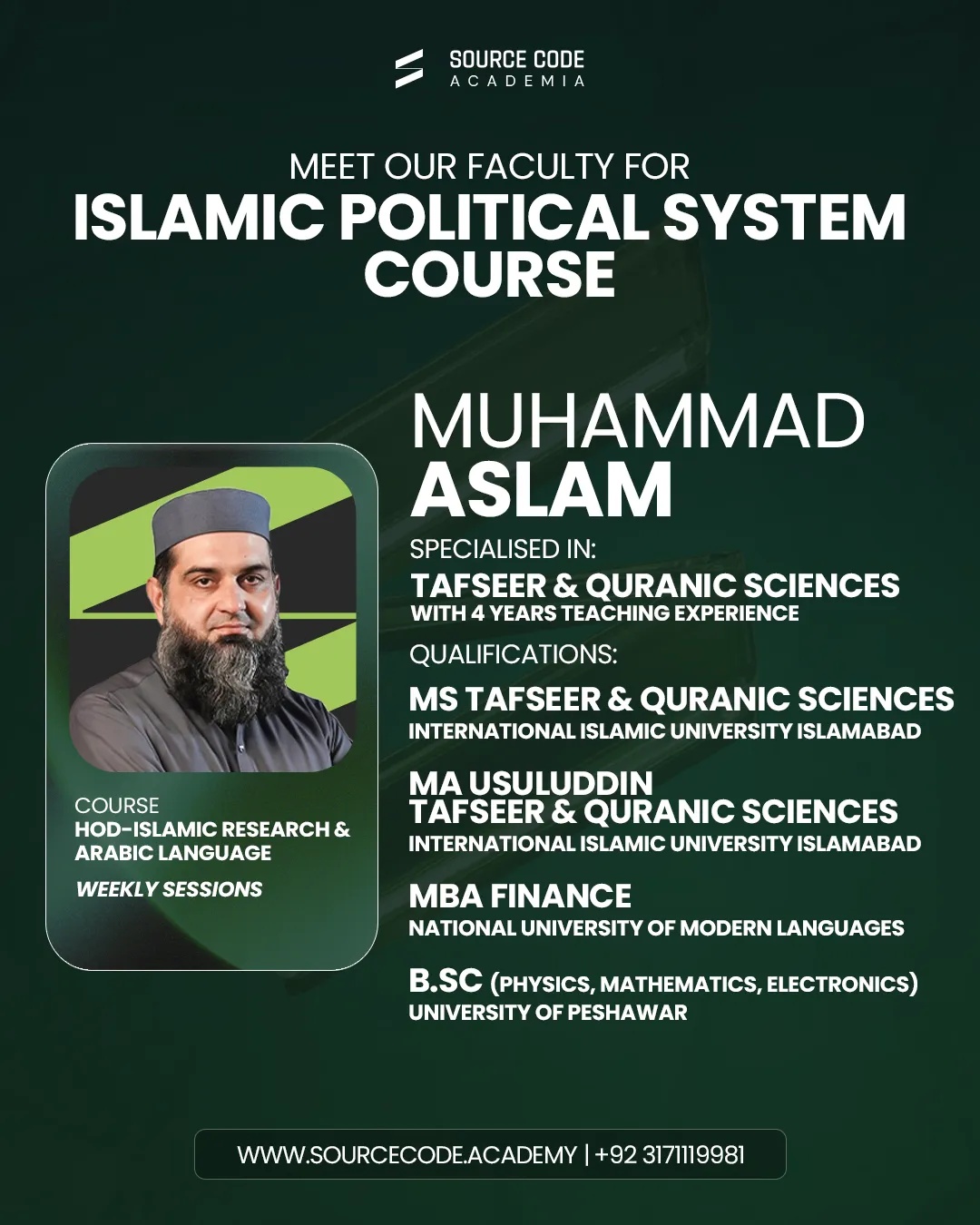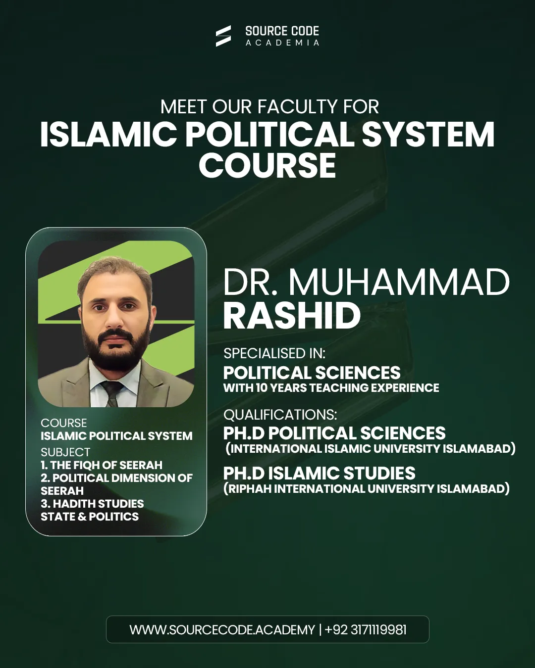 The objective of this course is to provide students with an advanced and comprehensive understanding of the Islamic political system based on the Qur’an, Sunnah, and historical practice of early Islamic governance. The course aims to critically examine political Tafseer, the political dimensions of the Seerah, the methodologies of the Prophets AS the governance approaches of the Sahaba RA, the structure and principles of the Rightly Guided Caliphate, and classical and contemporary Hadith related to statecraft and governance.